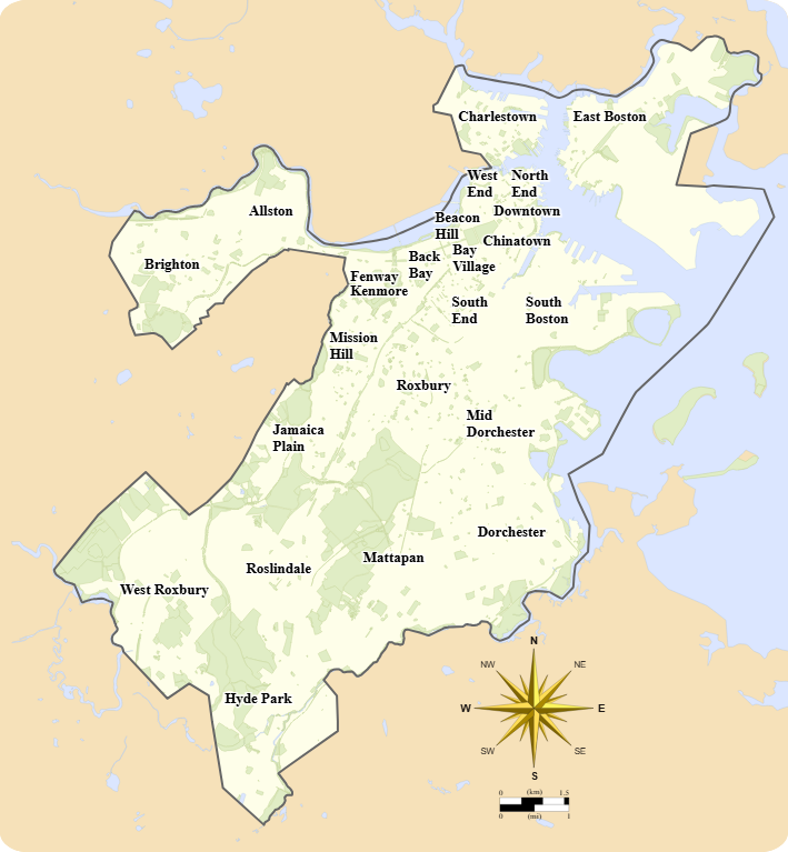 This is a map of modern-day Boston, with a neighborhood breakdown on it, per the city’s Office of Neighborhood Services: